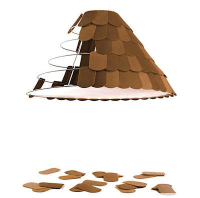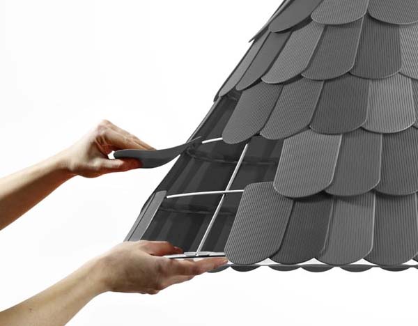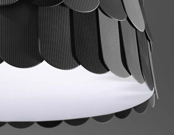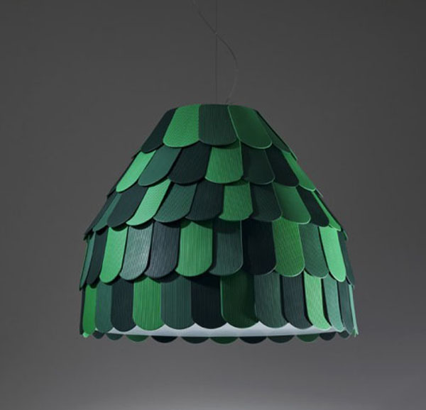 La lámpara colgante Roofer es una forma creativa de ver las cosas desde otra perspectiva. El diseñador Benjamin Hubert creó esta lámpara colgante especial para el fabricante italiano Fabbian. La inspiración para este proyecto provino de los azulejos de colores de Marrakech. Se cuelgan baldosas flexibles de silicona en un marco de metal, al igual que las tejas cubren la característica más importante de una casa.
